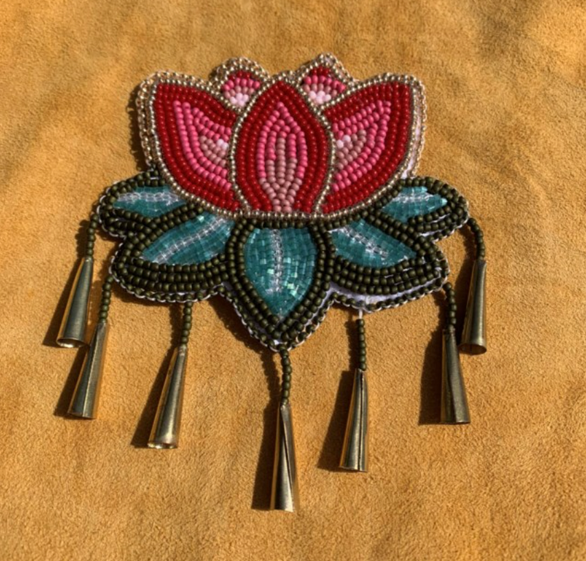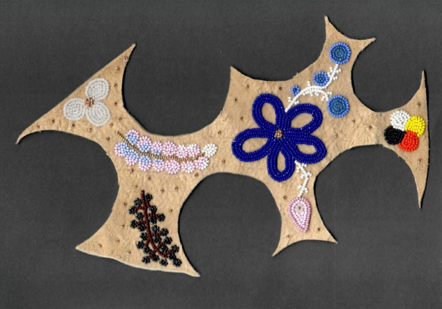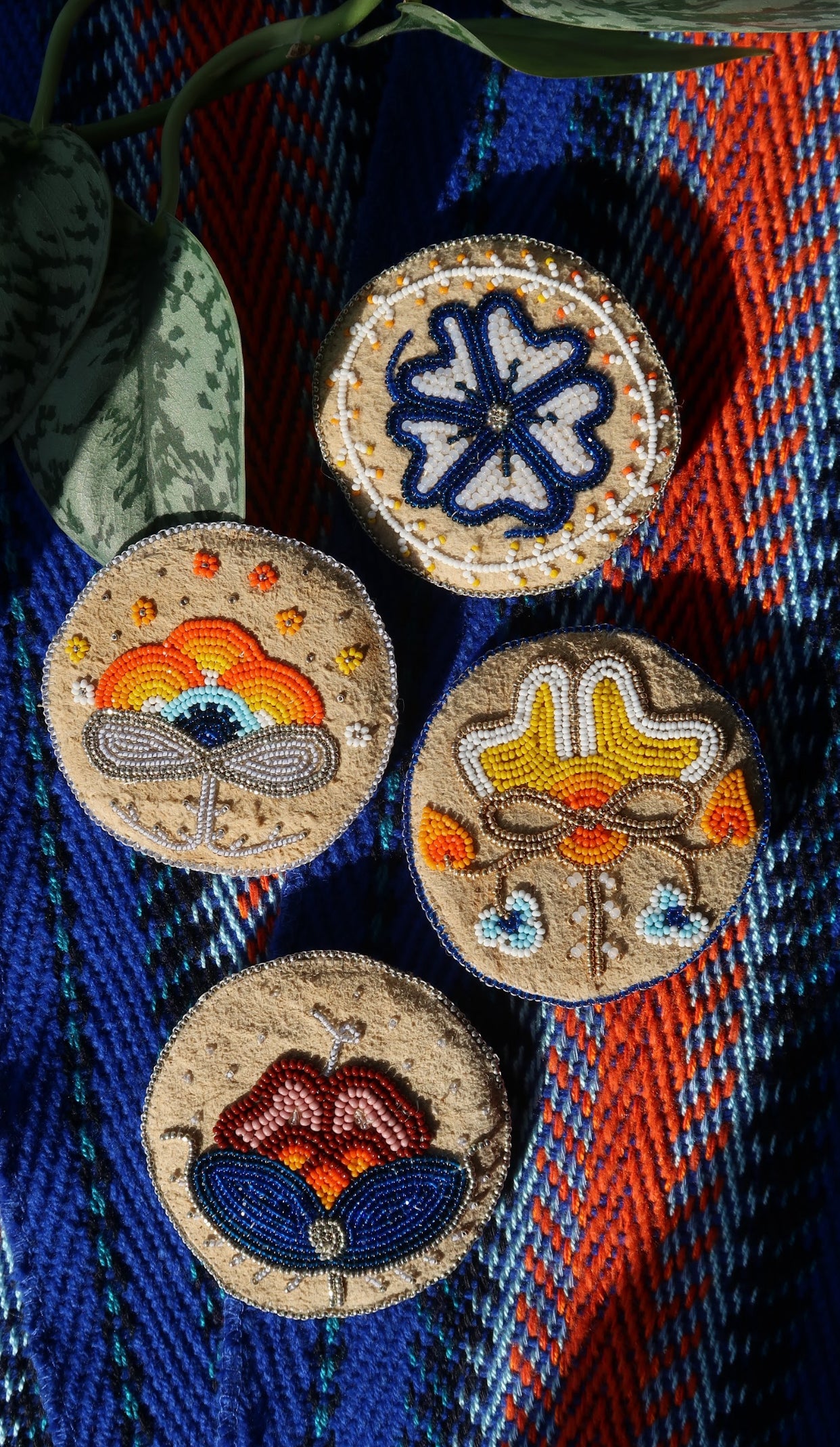 6 Pins, freehanded and based on grandmother pieces from the GDI. Made with traditionally brain tanned hide from Vancouver Island, bought from an elder. The beads used are size 13 charlotte cuts. The designs are based of the prarire rose and the colours of the Métis youth sash.