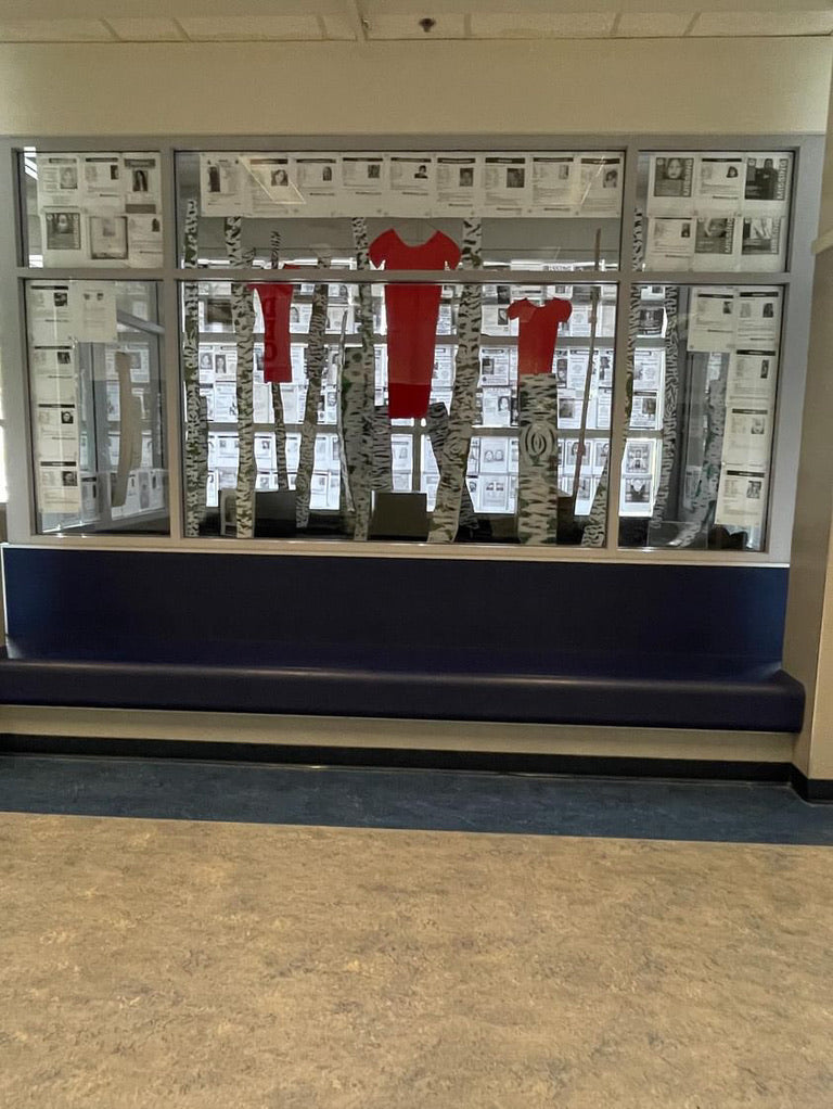 An art installation I designed for MMIWG day, May 5. I sewed the red dresses, different sizes for the different ages of girls that go missing. There are hand painted birch trees to mirror the art installation in the Museum of Human Rights in Winnipeg. The sides and back of the mural are lined with current missing posters of Women around Turtle Island.