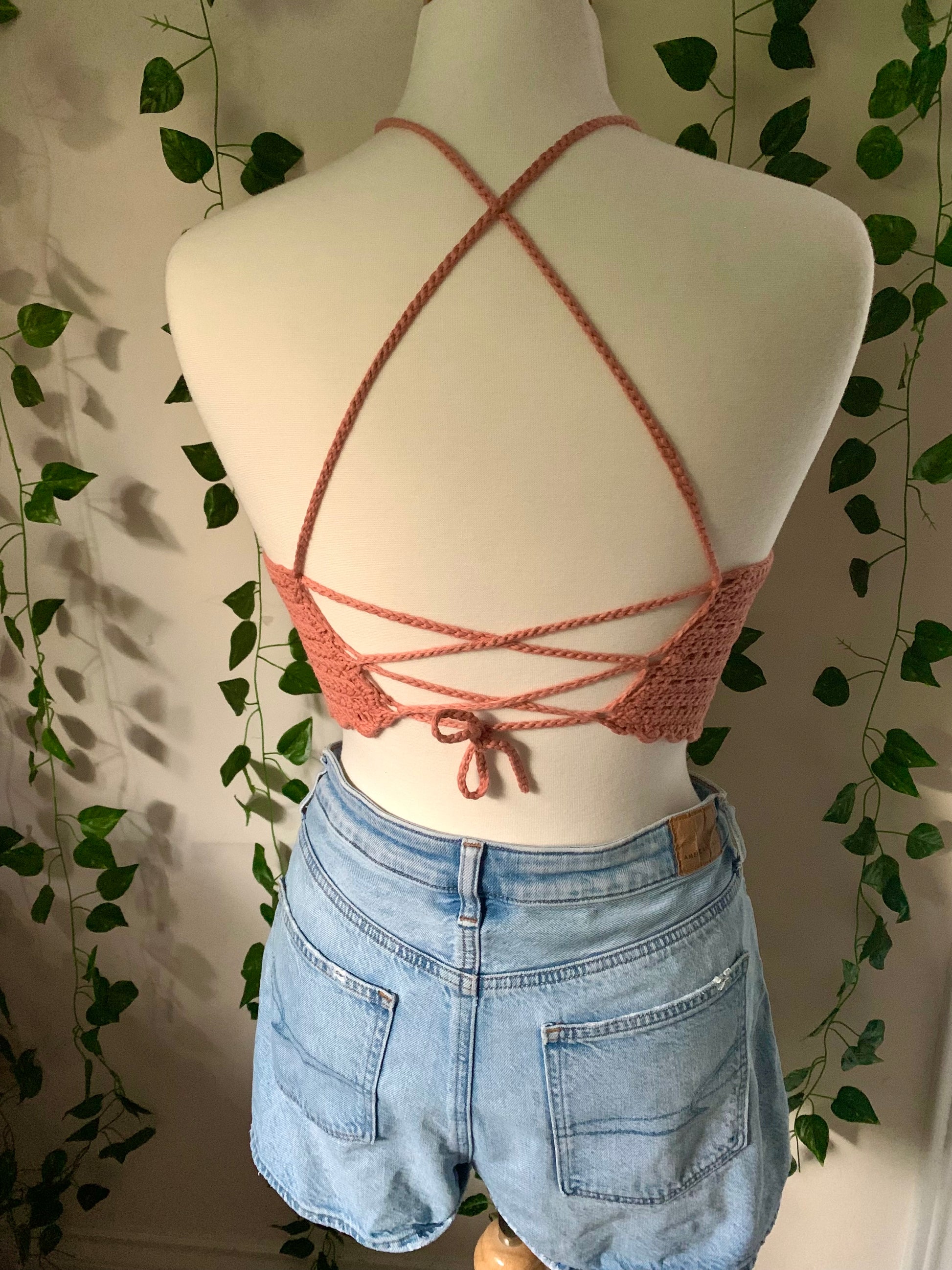 Love a fuller coverage top, but love the original design? This top is for you! Made with a very fine cotton yarn + the stitched up v-neck gives a lot of coverage. Back is a corset style so can fit a range of sizes :)